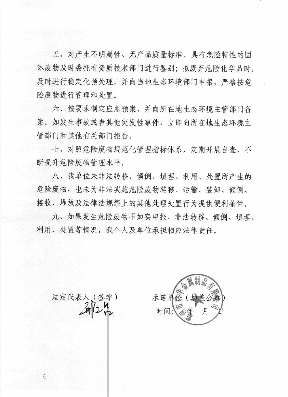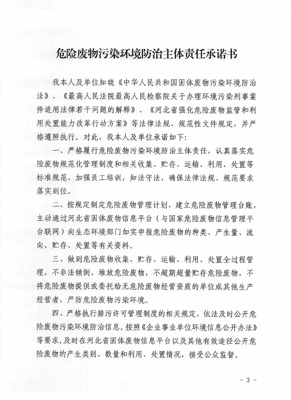 危险废物污染环境防治主体责任承诺书