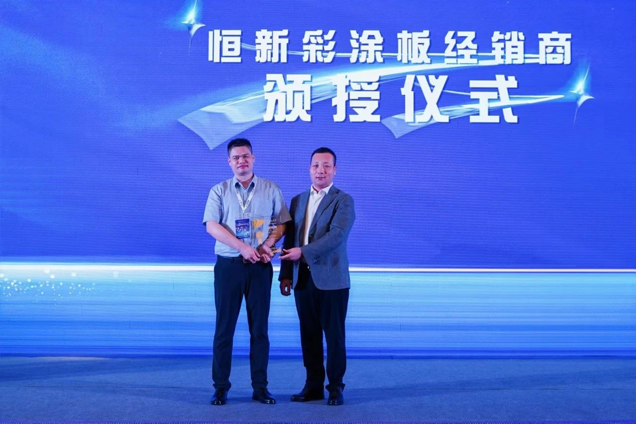 在恒新彩涂板经销商授权仪式上,NG娱乐兆建公司总经理陈铁柱先生向联合举办方佛山市常松钢材贸易有限公司总经理戴清洪先生颁发了授权牌,并同与会嘉宾上台合影留念,在现场嘉宾的共同见证下开启深度友好合作新篇章!