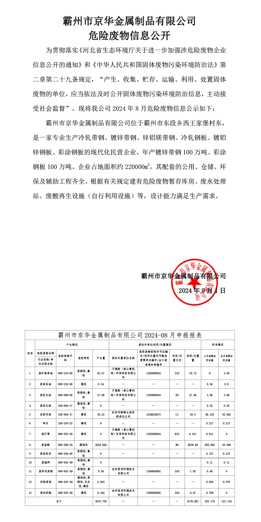 24年8月危险废物信息公开-NG娱乐·(中国区)官方直营平台